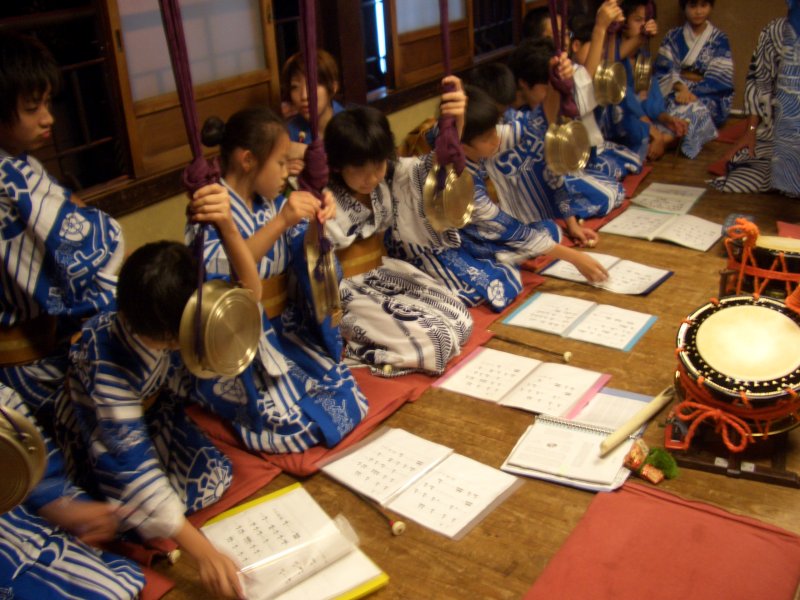 つりをして、お囃子の楽器、鉦や太鼓を体験で演奏してもらったり。