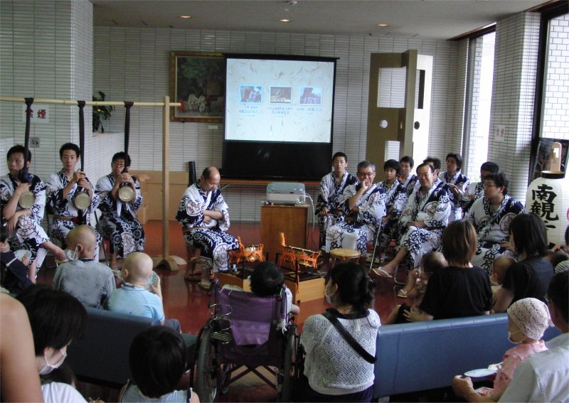 入院や加療のため、夏休みやお祭りを、なかなか楽しめない子供たちに向けての、ボランティアの方々による、夏祭り企画の一つとして、祇園祭のお囃子を楽しんでもらおうというものです。