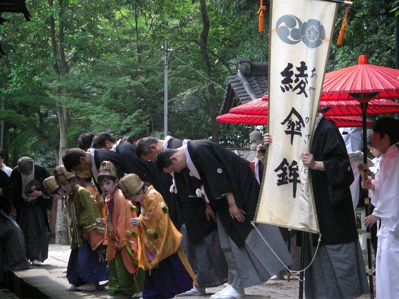 稚児に選ばれた6人が神前に報告し、祭りの無事を祈願し、役員たちと契り