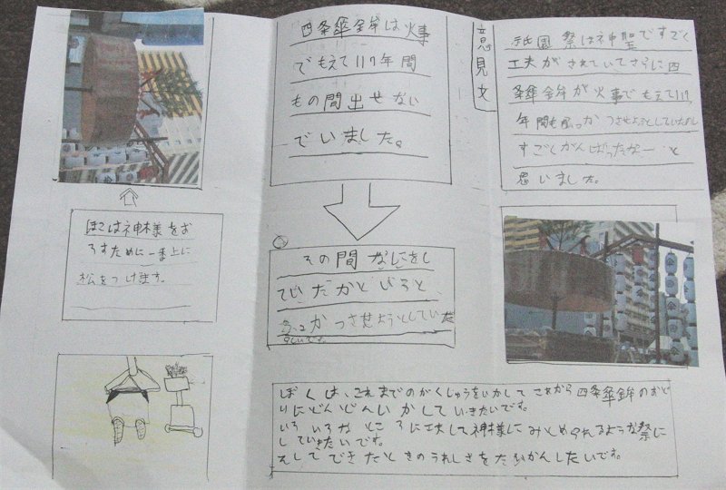 四条西洞院(しじょうにしのとおいん)の四条傘鉾に来ると、洛央小学校の5年生達が、自主研究 した、祇園祭についての資料を配ってくれてました。