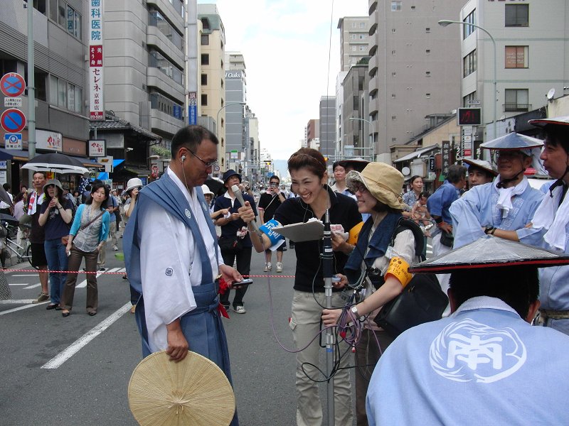 四条新町まで出ると、北観音山と八幡山が通り過ぎるのをまちます。 このとき、KBS京都ラジオの取材があり、今年の神事役である、囃子方の山崎さんへインタビュー。