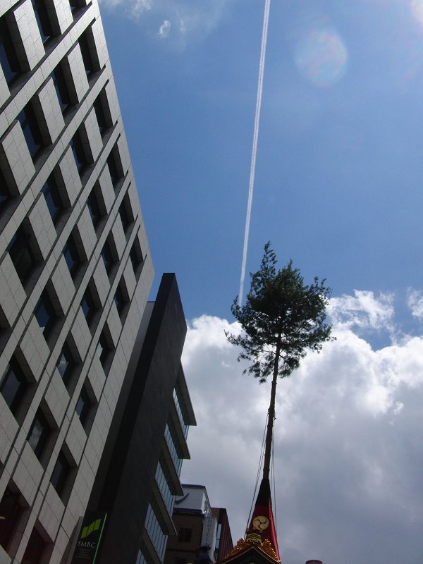 烏丸通りを過ぎたあたり、暑いなぁと見上げると、飛行機雲が。